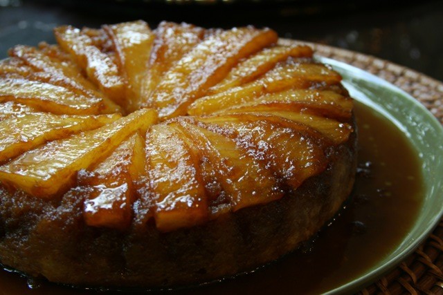 Melt butter and pour into an in 8” cake pan. Sprinkle with brown sugar and sprinkle some sea salt over nice and evenly. Arrange pineapple over sugar mixture. In a bowl, add flour, sugar, baking powder and a pinch more sea salt; mix well. Add butter, milk and vanilla. Beat for 2 minutes. Add egg. Beat for 2 more minutes. Pour mixture over pineapple.