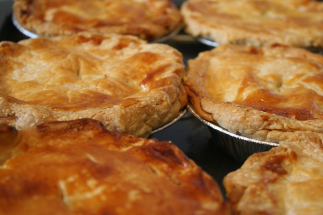 Bake large pies for a little over 1 hour and minis for 45min. or until golden brown.