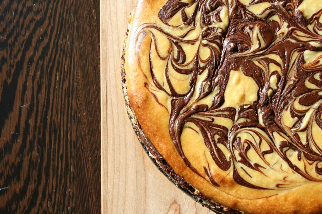 Drizzle the rest of the chocolate over top of batter . With a long wooden skewer or a knife , make 3 big figure 8 patterns through chocolate and batter carefully minding not to scrape the crust.
